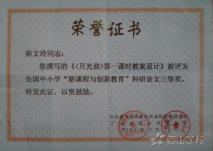 步入2005年,西山学校小学部不断努力,教学工作持续发展,各竞赛活动不断传来佳讯。学校荣获了福建省民办教育先进单位称号、“青春玉融,爱我家乡”福清市青少年现场绘画大赛组织奖、全国励志教育示范基地称号、蒲公英第五届优秀艺术新人选拔活动中获奖,老师们在教学研究上也传来捷报,撰写的论文纷纷获奖,彰显出小学部雄厚的师资力量。