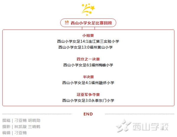 本次夺冠是对教练员和队员刻苦训练的最好回报和最大鼓励,也充分地展现了西山师生“勇于挑战,乐观自信”的精神风貌。西山足球队将不骄不躁,踏实训练,团结一心,力争在福建省赛中取得更好成绩。