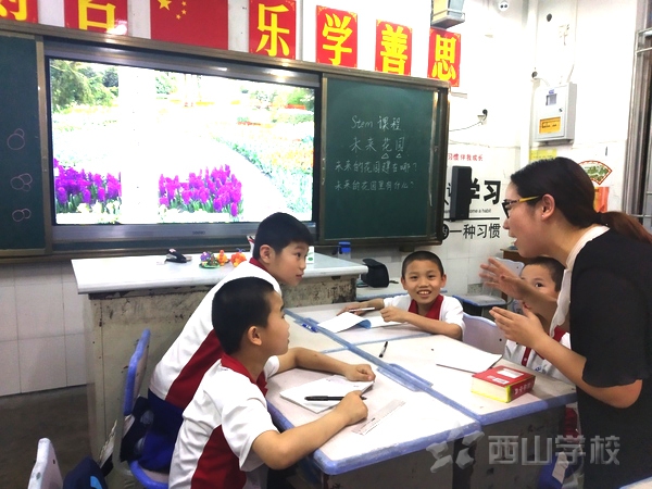小学部三至五年级围绕“未来”系列主题开展STEAM课程,三年级——未来花园、四年级——未来学校、五年级——未来城市。课堂上,老师们通过问题前置循序善诱并结合课件展示国外各种花园、学校和城市,让学生们了解的同时介绍相应的文化内涵,并以小组为单位共同讨论构思自己的作品思路。上课过程中,学生们积极讨论,踊跃发言,课堂气氛活跃。随后,学生们分组上台演讲,其他小组询问发言,主讲学生清晰准确的回答其他小组的疑问。最后,老师点评并作总结。